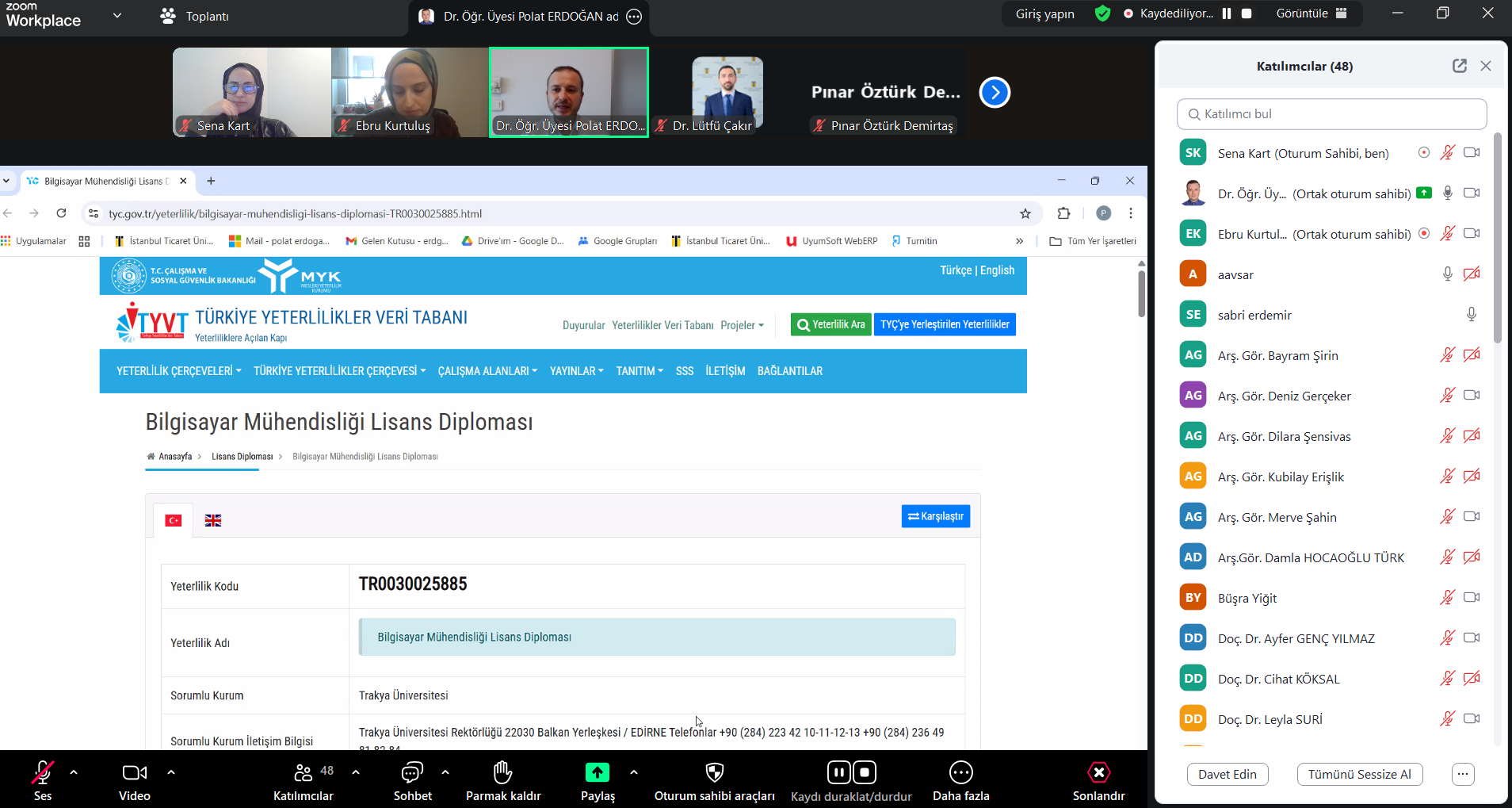 Eğitimde, Türkiye Yeterlilikler Çerçevesi (TYÇ) formlarının doldurulması ve TYÇ veri havuzuna işlenmesi süreçleri ile Bologna web sayfasında program ve ders bilgi paketlerinin hazırlanmasına yönelik esaslar ele alındı. Katılımcılara, TYYÇ, TAY ve PÖÇ matrislerinin oluşturulması, bölüm web sayfalarında paylaşılması, ders bilgi paketlerinin güncellenmesi ve AKTS hesaplamalarının yapılması gibi konularda uygulamalı bilgiler sunuldu.
